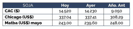 En la jornada de hoy, el mejor valor de compra abierto por soja condición fábrica con descarga fue de US$ 245/t, mismo precio que el que se ofreció el día de ayer a últimas horas. No se evidencian operaciones significativas en este segmento a estos valores.