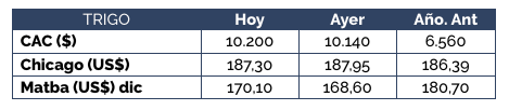 En el día de hoy, el valor abierto de compra por trigo con descarga en noviembre fue de US$ 162/t, con diciembre ofreciéndose en US$ 167. Sin embargo, estos valores no son representativos del mercado, dado que se registran operaciones en US$ 170/t para la descarga en ambos meses en el registro público.