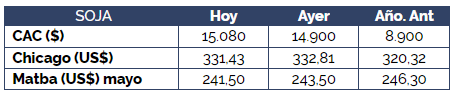 En cuanto a la soja de campaña 2019/20, el valor de compra por soja con entrega entre abril y mayo de 2020 fue de US$ 240/t condición fábrica, y US$ 243/t condición cámara; este último presentando una suba de un dólar en comparación con el precio abierto del día de ayer.
