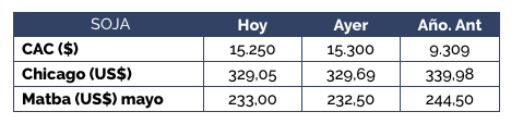 En la jornada de hoy, la actividad en el mercado de soja se mantuvo muy escasa, donde recién al final de la rueda de operaciones se obtuvo un precio abierto de compra que alcanzó los US$ 248/t para la operatoria contractual. Dicho valor fue US$ 5/t menos que lo ofrecido en la jornada de ayer. No obstante, según los datos provistos por el registro oficial de operaciones de compra-venta de granos la mayor parte de las operaciones por mercadería disponible se concretaron a partir de los US$ 253/t.