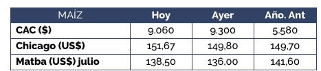 El mercado de maíz destacó, en sintonía con lo sucedido en las ruedas previas, siendo el mercado más activo y con mayor atención por parte de los compradores. Se incrementó el valor abierto ofrecido por los compradores hasta los US$ 150/t por el cereal con descarga inmediata. Ello representa un aumento de US$ 5/t respecto a la jornada previa.