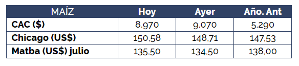 La oferta abierta por maíz con entrega contractual se ubicó en los US$ 140/t, mismo valor que en el día de ayer.