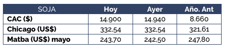 En la jornada de hoy, tuvimos una suba en el precio abierto de compra por soja disponible; el precio por soja con descarga fue de US$ 252/t, abierto sobre el final de la rueda, mejorando US$ 7/t con respecto a la jornada de ayer, y sin descartar mejoras por lote.