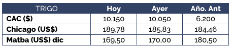 En el día de hoy, el precio abierto de compra por trigo con descarga se ubicó en los US$ 165/t, sin embargo, en el registro público de operaciones de compra-venta de granos se registran operaciones por US$ 170/t, valor similar a las jornadas previas. En cuanto al trigo con descarga en diciembre, el mejor valor de compra fue de US$ 167/t, sin descartar mejoras. También se registran compras por trigo con descarga entre el 15/12 y el 15/1 por US$ 170/t.
