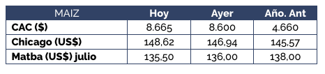 En la jornada de hoy, el precio de compra por maíz disponible se mantuvo en los US$ 145/t; donde tuvimos una mejora fue en el precio de compra ofrecido por maíz con entrega diferida de la presente campaña, con un comprador ofreciendo US$ 148/t por compra de maíz con entrega en diciembre/enero 2020.