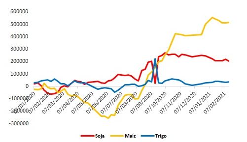 En el gráfico puede verse el resultado entre contratos comprados y vendidos en el mercado de Chicago desde principios de 2020 hasta hoy, y como las líneas de soja, trigo y maíz han permanecido por encima de cero desde agosto 2020 hasta ahora. Es decir que, los volúmenes de contratos comprados han sido mayores a los vendidos, apostando a vender más adelante a mayor precio, obteniendo ganancias por diferencia entre compra y venta.