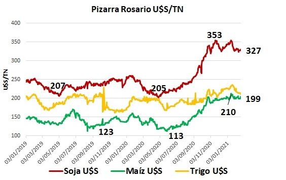 En maíz, los mínimos en pizarra en 2020 se dieron entre abril y agosto, y, al igual que en soja, vemos los máximos en enero 21, con sostén en torno a U$S 200/TN después de esa fecha, tanto para el disponible como para el maíz abril, mientras julio se sostiene en torno a U$S 190/TN.