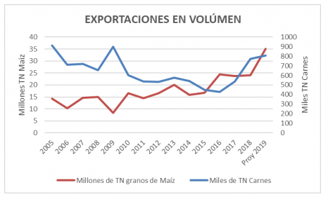 Veamos primero el volumen exportado de maíz y de carnes, sumando la exportación bovina, porcina y aviar. Se han exportado desde 9 a 35 millones de toneladas de granos de maíz, siendo 35 millones el mayor volumen proyectado para la presente campaña, en la que ya llevamos más de 25 millones exportados. La exportación de carnes ha bajado de un máximo de 910 mil toneladas en 2.005, a un mínimo de 430 mil toneladas en 2016, para quedar en una proyección de 807 mil toneladas en el presente 2019.