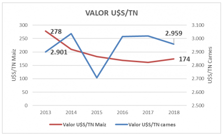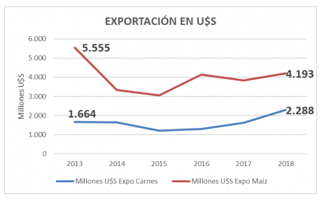 El significado de estas exportaciones en cuanto a ingreso de Dólares al país, se observa desde el 2013 hasta el 2018 en el siguiente gráfico. Vemos el aumento de ingresos en carnes y la disminución en maíz.