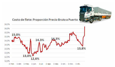 Para poner en números el impacto del flete, sobre el precio bruto del maíz a puerto, se consideró un flete corto chacra-galpón y un flete largo de 120 kilómetros, y se obtuvo la proporción del precio del flete sobre el precio a puerto, según la evolución de los precios disponibles durante el año.