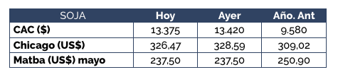 Como en la rueda de ayer, no se registró un valor abierto por soja nueva, aunque la idea de precio se situó en US$ 233/t para abril/mayo del año siguiente.