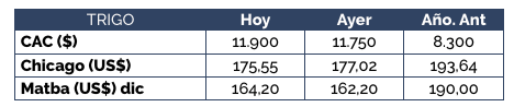 El precio ofrecido abiertamente por trigo con entrega hasta el 4/10 fue de US$ 205/t, aunque resulta muy probable la concreción de negocios por un valor superior.