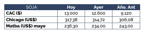 En la rueda de hoy, hubo un considerable nivel de negocios por soja disponible, estimulado por un aumento en el precio ofrecido abiertamente. En el día de hoy, el precio generalizado por soja disponible fue de US$ 240/t o $ 13.400/t, $ 570/t por encima del valor abierto del día de ayer.