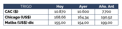 Esta mejora no se evidenció en los precios ofrecidos por parte de la demanda para los negocios de nueva campaña; para la posición noviembre/diciembre el precio fue de US$ 150/t, con la posición enero cotizando en US$ 153/t, US$ 156/t para febrero y US$ 159/t marzo. El segmento de trigo nuevo presentó una actividad modesta.