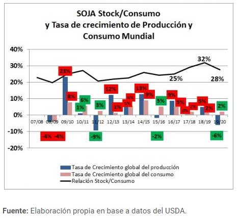 Sin embargo, la relación stock/consumo mundial 19/20 se proyecta en 28%, la fuerza alcista de una menor producción y mayor consumo es limitada, y dependerá de la presión que realice la demanda mundial de granos, de la que 30% corresponde a China, país que a su vez compra casi el 60% de las exportaciones de soja del mundo.