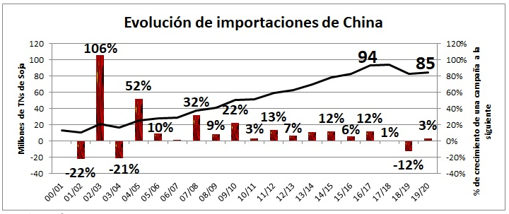 En el siguiente gráfico se observa la evolución de volumen de soja importado por China desde el 2000, y en las barras el aumento o disminución de importaciones de un año al siguiente. Solo en tres campañas las importaciones bajaron, una fue la 18/19, con una merma de importaciones del 12%. Se espera un aumento de las importaciones del 3% en la 19/20, que significa 2,5 millones de toneladas, no tan significativo como para sostener alzas en el mediano plazo