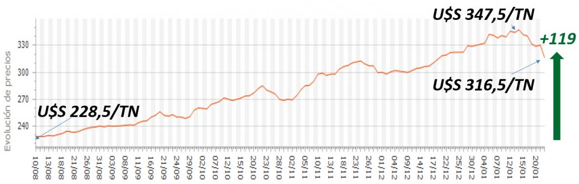 Si vemos en el Ministerio de Agricultura de la Nación, al 13 de enero 2021 se habían comercializado 6 millones de toneladas de soja 20/21, de las que solo 2,7 millones tienen precio, el resto fue vendida “a fijar”. Por otro lado, si pasamos al volumen de ventas futuras de soja Matba-Rofex, considerando el total de toneladas operadas hasta el 22 de enero pasado, entre las posiciones mayo, julio, septiembre y noviembre 2021, son 6,4 millones de toneladas. A los fines de simplificar en solo futuros del Mercado a Término y ventas futuras con precio en el mercado físico, tenemos un total de 9,1 millones de toneladas con cobertura de precios para la nueva cosecha de soja, volumen que, con una proyección de 46,5 millones de toneladas, según estimaciones propias, tenemos menos del 20% de la próxima cosecha con cobertura de precios lo que, ante subas que llevaron la cotización de soja mayo 2021 a máximos de U$S 347,5/TN, valores casi U$S 120/TN por encima del precio que tenía ese futuro en agosto 2020, previo a las subas.