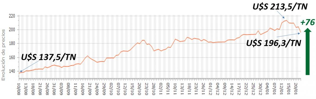En maíz tenemos ventas con precio y compromiso de entrega en el mercado físico por 9,5 millones de toneladas hasta el 13 de enero, último registro publicado por el Ministerio de Agricultura. En cuanto al volumen de maíz 20/21 con coberturas de futuros Matba-Rofex, en las posiciones abril, junio, julio, septiembre y diciembre 2021 tenemos en suma un total operado de 5,5 millones de toneladas. Considerando una estimación propia de 45 millones de toneladas para la cosecha de este año, tenemos el 33,3% de la misma con precio o cobertura de futuros. Con precios del futuro abril 2021 que han superado en U$S 76/TNa las cotizaciones de agosto pasado, tocando máximos de U$S 213,5/TN, sumado a los anuncios de control de la comercialización de este cereal, ha causado un fuerte avance en las ventas anticipadas y cobertura de precios, lo que nos trajo a asegurar un tercio del maíz 20/21 proyectado.