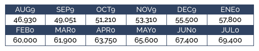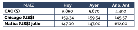 El valor ofrecido por maíz con descarga se ubicó en los $ 5.800/t, siendo este el segmento con mayor volumen de negocios en la jornada. Para el maíz con descarga contractual el precio subía hasta los $ 6.000/t. El precio ofrecido abiertamente para el cereal con descarga en septiembre fue de US$ 142/t, con US$ 145/t para los negocios a octubre, ambos exhibiendo una mejora. Con respecto al mes de noviembre el precio fue de US$ 146/t., situándose en US$ 145/t para diciembre y US$ 140/t la posición enero.