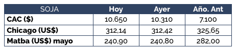 En la tarde de hoy, el valor ofrecido abiertamente por soja disponible se situó en $ 10.650/t condición fábrica, aumentando en $ 50/t con respecto a la sesión anterior, y pudiendo exhibir mejoras. Sin embargo, este aumento de precios no resultó suficiente para estimular un gran nivel de negocios. No se descartan negocios de soja con descarga futura y cobro anticipado.