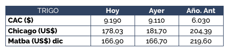 En la rueda de hoy el valor abierto por trigo contractual fue de US$ 190/t, pudiéndose conseguir mejoras en este valor de hasta US$ 10/t. Con respecto al segmento diferido, el valor ofrecido para los meses de noviembre/diciembre se ubicó en US$ 160/t, al igual que en la jornada de ayer. En cuanto a la posición enero, el precio fue de US$ 162/t, aumentando hasta US$ 165/t para el mes de febrero. Con respecto al trigo con entrega en el mes de marzo, el valor abierto registrado se situó en los US$ 168/t. No se registraron variaciones importantes en los precios de este mercado.