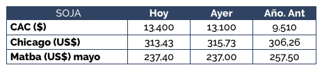 En la jornada de hoy, el valor ofrecido abiertamente por soja con entrega inmediata fue de US$ 232/t. En cuanto al segmento diferido, el precio ofrecido fue de US$ 232/t para la oleaginosa con entrega en el mes de mayo. A diferencia de ayer, no se registró valor abierto alguno por la posición octubre.