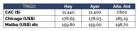 En el día de hoy, el precio ofrecido abiertamente por trigo con descarga hasta el 27 de septiembre, fue de US$ 205/t, aunque no se descartan mejoras en cuanto a este valor. Además, el valor en el disponible fue también de US$ 205/t, US$ 5/t superior con respecto al día de ayer