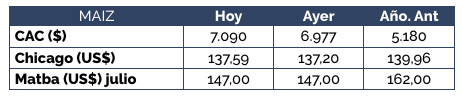 En lo referente a maíz de la nueva campaña, el valor abierto para las posiciones de marzo/abril/mayo fue de US$ 135/t, con US$ 130/t para los meses de junio/julio.