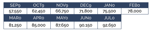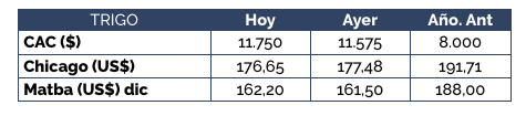El precio ofrecido abiertamente por trigo con entrega hasta el 30/9 fue de $ 11.800/t. Además, se ofreció un valor de US$ 250/t para entregas hasta el 4/10, al igual que en la jornada de ayer. Por último, para cereal con descarga hasta el 15/10 el valor abierto ofrecido fue de US% 170/t.