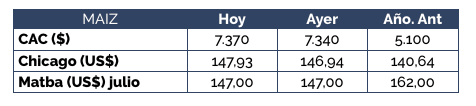 El precio ofrecido abiertamente por maíz disponible fue de US$ 128/t, al igual que en el día de ayer. Con respecto a la posición a octubre el precio se ubicó en los US$ 132/t, con US$ 133/t para noviembre y US$ 137/t para el mes de diciembre.