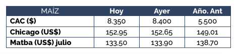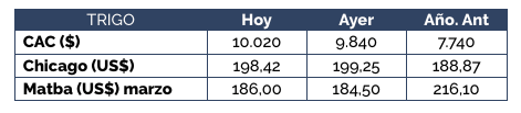 En la jornada de hoy, tuvimos dos compradores activos en el mercado de trigo. La mejor oferta de compra por mercadería condición contractual, sin descarga inmediata, se ubicó en los US$ 170/t, para luego bajar dos dólares hacia el final de la rueda de negociaciones. La actividad por trigo, aunque escasa, fue lo que destacó en la jornada.