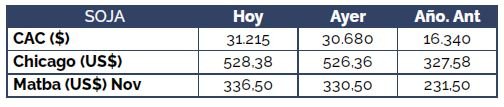 Por soja con entrega disponible se ofrecieron US$ 330/t, aumentando US$ 5/t respectivamente. Mientras que, en moneda local, este ofrecimiento alcanzó los $ 31.650/t. Estas mismas ofertas fueron realizadas para el caso de fijaciones.