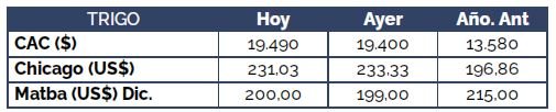 El trigo finaliza el martes con pérdidas. La consultora Sovecon recortó en 2,3 Mt sus previsiones de producción de trigo de Rusia, principal exportador mundial del cereal, que totalizaría su producción triguera en 82,3 Mt. No obstante, la Unión Europea, principal competidora de los rusos, va camino a una cosecha récord de la mano de una excelente campaña en Francia, lo impulsa hacia abajo los precios.