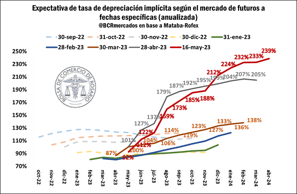 Para ponerlo en perspectiva, con una tasa de devaluación implícita del 200% a diciembre, se requeriría un crawling al 16,9% mensual, casi 3 veces el ritmo actual.