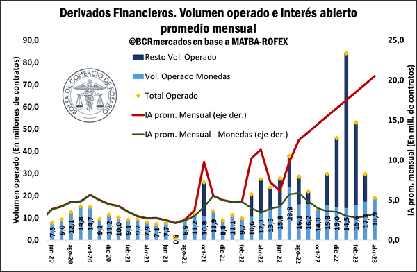 En este sentido, el volumen operado en derivados de monedas viene creciendo paulatinamente desde diciembre, alcanzando en abril los 18,9 millones de contratos, mientras que la operatoria del resto de los derivados viene descendiendo a gran velocidad desde enero, mes en el que alcanzó casi 70 millones de contratos operados.