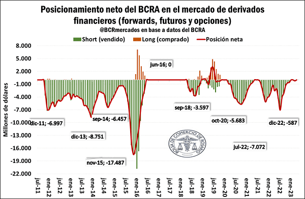 Además, debe tenerse en cuenta que, a pesar de la presión de los futuros, el BCRA no está operando este mercado desde diciembre pasado, con un posicionamiento neto neutral, a diferencia de lo ocurrido en los dos años anteriores, cuando generalmente detentaba una posición vendedora. Esto significa que son los privados quienes están tomando posiciones contra la divisa americana.