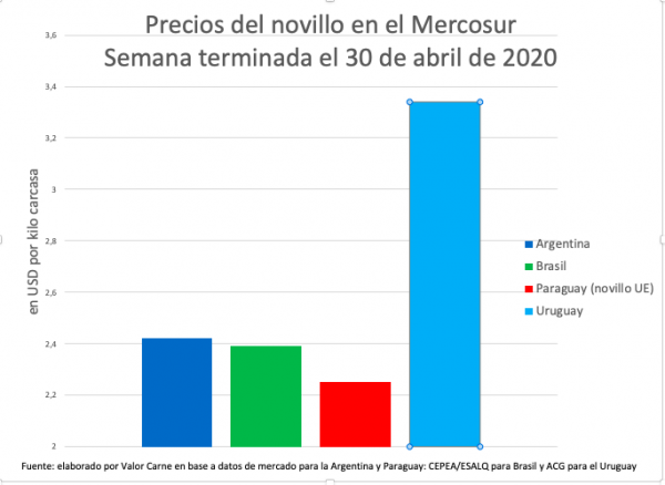 Paraguay: en un estado bastante incierto del mercado, ya que los productores hablan de un precio de USD 2,20 mientras que frigoríficos dicen estar pagando 2,30, a los efectos de los registros de Valor Carne consideramos 2,25 como un valor representativo. Esto significa una mejora de 5 centavos o poco más del 1%.