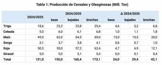Bajo ese supuesto, los técnicos de la Bolsa modelaron distintos escenarios para cereales y oleaginosas. En un escenario base, sin acuerdo y con condiciones macroeconómicas estables, la producción total hacia la campaña 2034/35 se ubicaría en torno a los 155 millones de toneladas.
