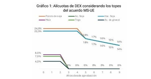 En el caso de la soja, por ejemplo, el acuerdo fija un esquema de reducción gradual: comenzaría con un tope del 18% y descendería progresivamente hasta el 14% en el décimo año.