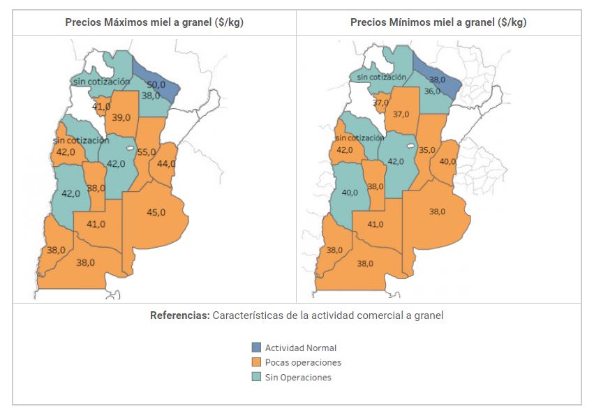Los precios máximos y mínimos de la miel comercializada a granel registrados en las distintas regiones relevadas de Argentina, en general, no han sufridos incrementos respecto al mes de Junio, donde el precio mínimo fue de 35 $/kg y el máximo de 55 $/kg. Es importante destacar respecto a la cantidad de operaciones que, que en la mayoría de las regiones se registraron pocas operaciones y, más aún, en algunas otras no se verificaron operaciones, debido a que queda poca miel en stock y en otros casos, no hay demanda de los exportadores. En algunos casos, las operaciones registradas pertenecen al sistema cooperativos de comercialización. En Mendoza, Córdoba, Chaco sólo hubo precios de referencia.