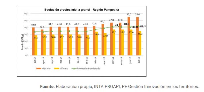 En la región pampeana, los precios mínimos y máximos para esta región se ubicaron en 35 y 55 $/kg respectivamente mientras que el precio promedio ponderado, de acuerdo a la cantidad de colmenas por provincia, se ubicó en 42,3 $/kg, levemente superior al registrado en junio/2018.