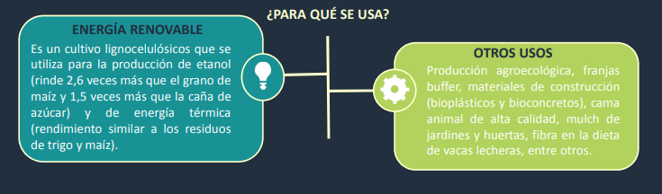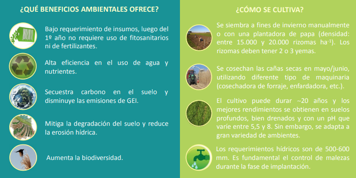 La necesidad de desarrollar energías alternativas se ha acelerado debido a la crisis energética mundial y a los problemas ambientales que presentan muchos de los recursos que se utilizan. Debido a esto, los cultivos bioenergéticos de ciclos C4 están siendo valorizados para la producción de energía renovable (etanol y/o calor). Entre estos, Miscanthus x giganteus es uno de los más atractivos. Este híbrido estéril originario de Asia, resultó elegido por su alta productividad, su bajo requerimiento de insumos, su alta eficiencia en el uso de agua y nutrientes, su tolerancia a bajas temperaturas, su resistencia a plagas y su esterilidad. A su vez, presenta una elevada capacidad para secuestrar carbono en el suelo, reducir las emisiones de gases de efecto invernadero, disminuir la erosión hídrica y aumentar la biodiversidad. En nuestra región, su cultivo representa una oportunidad para reestructurar la actual agricultura monofuncional (bienes de provisión) por una polifuncional sustentable (bienes de provisión y otros servicios ecosistémicos), en la que los cultivos destinados a grano, forrajes y bioenergía comparten el paisaje rural y además, una alternativa productiva para las franjas periurbanas.