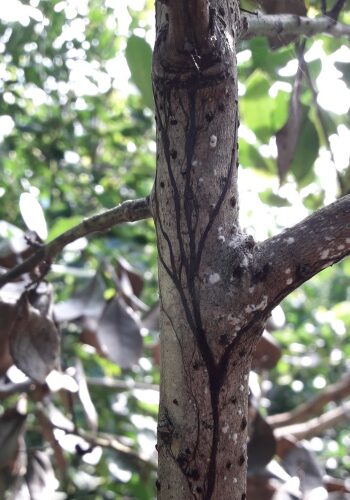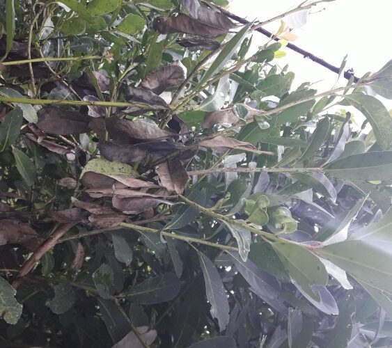 Los primeros síntomas se observan una vez que el hongo infectó la planta. “Aparecen ramas secas entre las copas y pueden verse las hojas colgando de las ramas por una especie de tela o hilacha fina de color marrón”, explicó Delia Dummel, responsable del laboratorio de Protección Vegetal del INTA Montecarlo, quien aclaró: “Esa característica es lo que le da el nombre ‘mal de la tela’ a la enfermedad”.