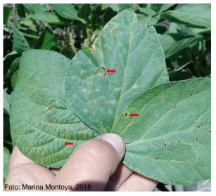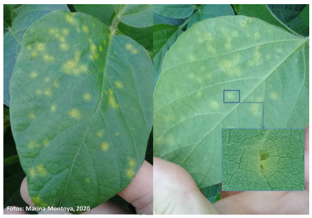 Respecto de las acciones de manejo que pueden tomarse en el corto plazo, una de las disponibles es la aplicación de fungicidas dirigidas a enfermedades foliares. Esto requiere considerar una combinación de varios factores (principalmente los relacionados con el ambiente, la etapa del cultivo y la presencia de síntomas en la campaña en curso o anteriores) y que esto no es una receta que pueda aplicarse de manera generalizada en todos los casos. Lo importante es recordar que el uso adecuado de los fungicidas prolonga su eficacia y es por ello una decisión que debe considerarse con cuidado y asesoramiento idóneo. Si se trata de enfermedades vasculares, éstas son de manejo complejo y poco puede hacerse para manejarlos en la campaña en curso una vez que se detectan. Una de las cosas que puede hacerse es tener los lotes identificados (previo diagnóstico del agente causal) ya que estos pueden ser fuentes de inóculo en el futuro. En nuestra zona las principales enfermedades vasculares incluyen al cancro del tallo por Diaporthe caulivora, la muerte súbita por algunas especies de Fusarium, las podredumbres húmeda por Sclerotinia; del tallo y raíz por Phythophtora; marrón por Cadophora gregata, el marchitamiento por especies varias de Fusarium y la mancha aceitosa por Tanatephorus cucumeris, entre las principales.