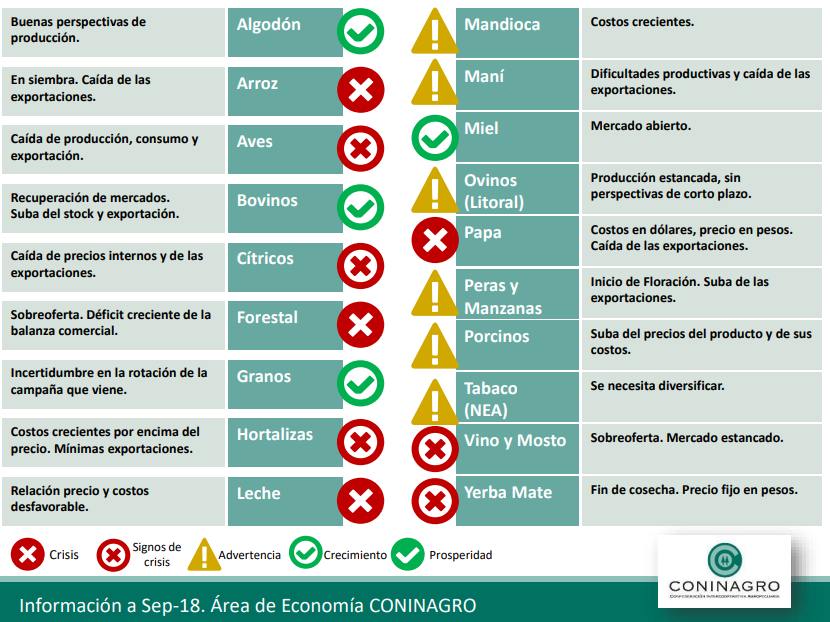 El semáforo elaborado por la entidad muestra que hay seis actividades en situación de “advertencia” que venían con una buena situación, pero con el cambio en los derechos de exportación hicieron caer su rendimiento. La lista la encabezan el maní, la mandioca, el ganado ovino del Litoral, las peras y las manzanas, los porcinos y el tabaco.