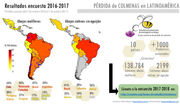 El Grupo de Monitoreo de pérdidas de colmenas de la Sociedad Latinoamericana de Investigación en Abejas, SOLATINA, integrado por 35 investigadores de 11 países, busca estimar los niveles de mortalidad de colmenas de abejas melíferas y de abejas nativas sin aguijón (meliponas) en la región, identificar los factores de riesgo que pueden estar asociados con la misma e inferir recomendaciones de manejo para mitigar las pérdidas.