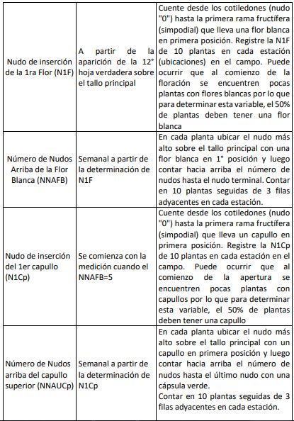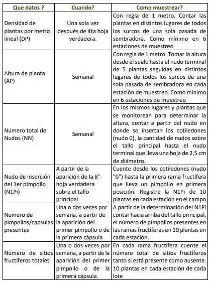 En la siguiente tabla se describen las principales variables a muestrear en un cultivo de algodón desde la emergencia hasta la apertura de capullos.