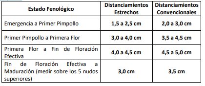 Este índice representa el cociente entre la altura total en cm y el número total de nudos sobre el tallo principal y se expresa en cm/nudo. Esta relación indica la calidad del ambiente que ha enfrentado una planta de algodón durante el ciclo, porque si bien el tiempo de desarrollo de los nudos no está influenciado por el estrés (por lo menos antes de la formación de las cápsulas), por el contrario, la altura de la planta está muy influenciada por diversos estreses. En otras palabras, el número de nudos es la edad del cultivo y la altura es un indicador de las dificultades encontradas. El valor objetivo (Tabla 1) para esta relación variará según el distanciamiento, la variedad y la época de la temporada, pero los siguientes valores pueden servir como pautas generales (en condiciones cálidas y húmedas) Tabla 1: Valores objetivos de LEP a lograr para diferentes estados fenológicos en distanciamientos estrechos (0,52 m o menores) o convencionales (0,76 m o mayores).