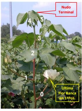 – Número de Nudos por Arriba de la Flor Blanca Superior (NNAFB) A partir de la aparición de la primera flor blanca en una rama fructífera del tallo principal, una medida muy precisa y sensible de la competencia intra-planta entre el crecimiento vegetativo y el crecimiento reproductivo, es el recuento del número de nudos por encima de la flor blanca (NNAFB) en primera posición más alta hasta el nudo terminal del tallo principal. A medida que el ciclo de fructificación del algodón progresa hasta alcanzarsu punto máximo, la planta no puede satisfacer las demandas de crecimiento vegetativo y reproductivo al mismo tiempo, por lo que prioriza el destino de los fotosintatos hacia el crecimiento reproductivo. A consecuencia de ello, el crecimiento vegetativo de la planta (producción de nudos) se ralentiza y finalmente deja de generar nudos sobre el tallo principal. Los pimpollos que se formaron en cada rama fructífera eventualmente forman flores que se acercan progresivamente al nudo terminal. El NNAFB generalmente comienza con una diferencia con respecto al nudo terminal de ocho a nueve nudos en Santiago del Estero y luego se mueve hacia arriba acortándose al cuarto o quinto nudo cuando se alcanza el Fin de la Floración Efectiva.