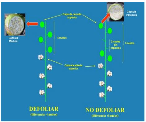 – Número de Nudos por Arriba del Capullo Superior (NNACp) Decidir cuándo defoliar un cultivo de algodón es una decisión importante desde varios puntos de vista. Si el cultivo de algodón se defolia demasiado pronto, los rendimientos, la calidad y los beneficios se ven afectados. Por otro lado, dependiendo de la ubicación y las condiciones del campo, retrasar la defoliación puede aumentar la probabilidad de problemas adicionales de insectos, aumentar la pudrición de cápsulas o retrasar la cosecha por mal tiempo, lo que afectará el rendimiento y la calidad de fibra. Es por eso que las decisiones de defoliación deben basarse en la madurez de los frutos de la planta. Una vez que los productores deciden que la defoliación es necesaria, deben determinar cuándo se debe aplicar el producto químico. Todas las cápsulas en la planta están relacionadas por un índice de floración que establece que las primeras posiciones de dos ramas fructíferassucesivas se forman cada 2,5 a 3 días de manera ascendente (índice de floración vertical) y cada 6 a 7 días dentro de cada rama fructífera (índice de floración horizontal). En la etapa de maduración, en la porción superior de la planta, la fijación de cápsulas en las segunda posiciones de las ramas fructíferas, cesa en forma más temprana que en las primeras posiciones de las ramas fructíferas. Por lo tanto, las cápsulas más jóvenes que se encuentran en el tercio superior de la planta, estarán representadas en un 90%, por cápsulas en primera posición (P1). Un método que se utiliza a menudo para determinar el momento de la defoliación es contar los nudos sobre el último capullo abierto superior en primera posición (NNACp). Esta técnica pone más énfasis en la porción sin abrir del cultivo que en el porcentaje abierto y se realiza detectando en cada planta, el capullo en la primera posición ubicado en el nudo de más arriba (o por lo menos que la cápsula este lo suficientemente agrietada para que la fibra sea visible) y contando los nudos por encima hasta el nudo más alto que tiene una cápsula verde cosechable (fisiológicamente madura) de más de 3,0 cm de diámetro en primera posición. Nuestras experiencias indican que un NNACp=4 suele ser seguro para la defoliación en cuanto a la calidad de fibra cosechada. No obstante, la mayoría de los agricultores inician los primeros defoliados con NNACp entre cinco y seis, por lo que la fibra de esas últimas capsulas tendrá algunos problemas de calidad.
